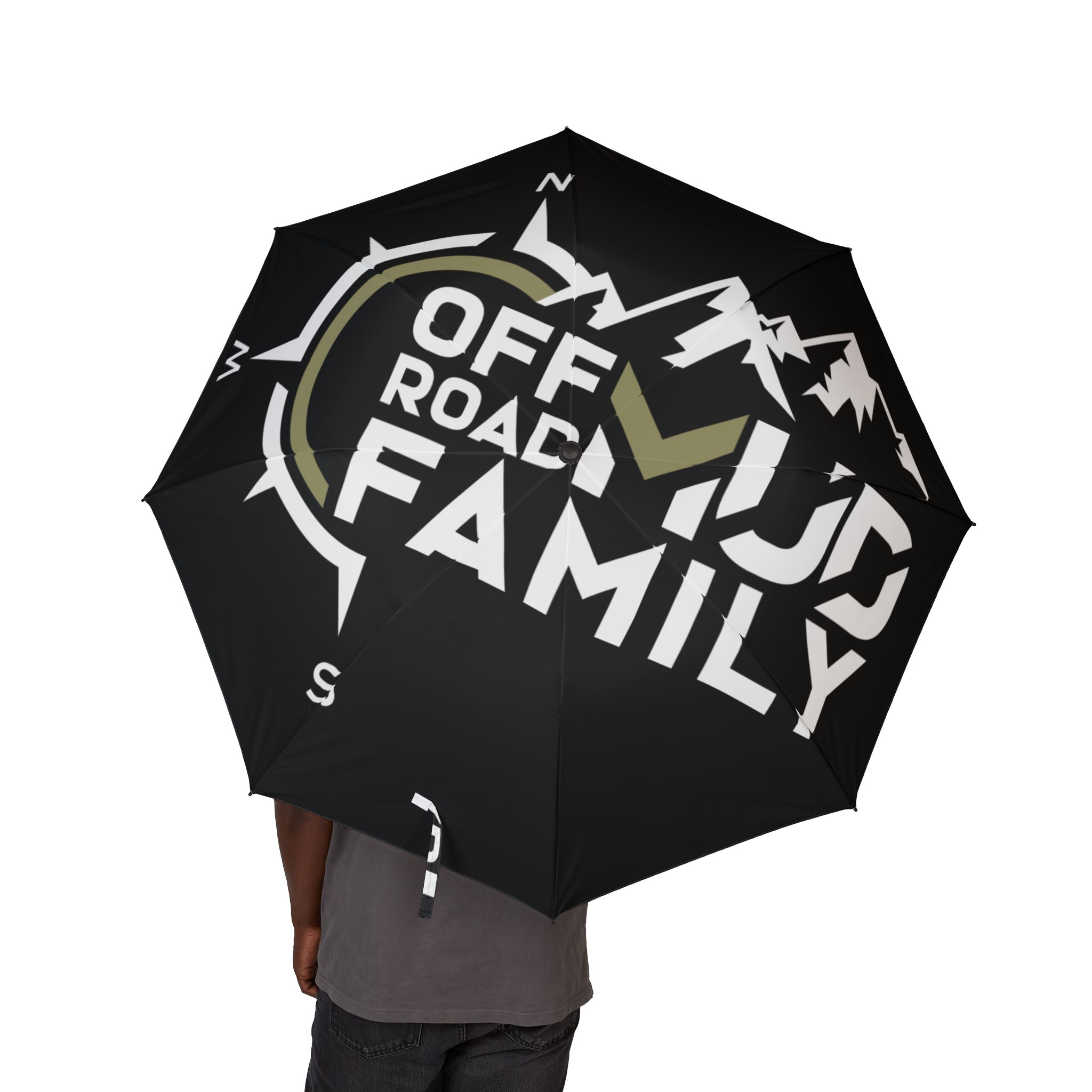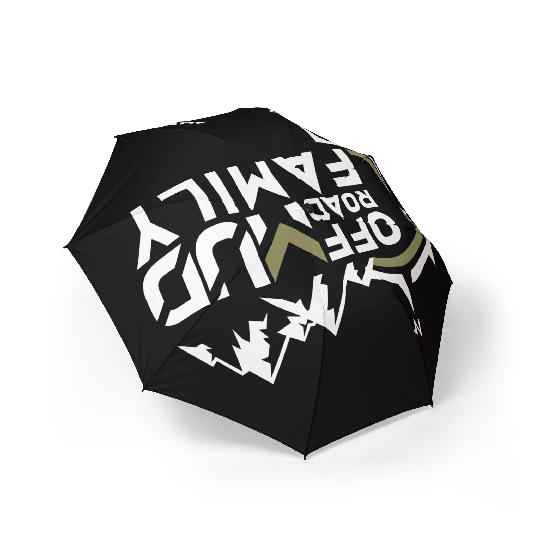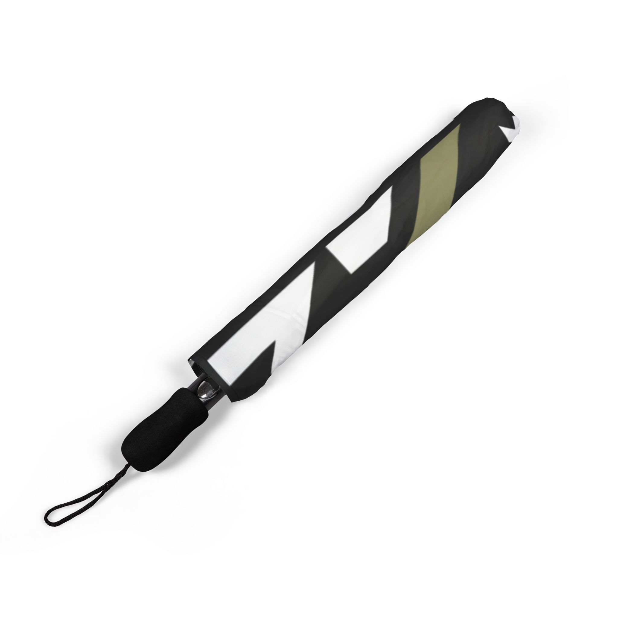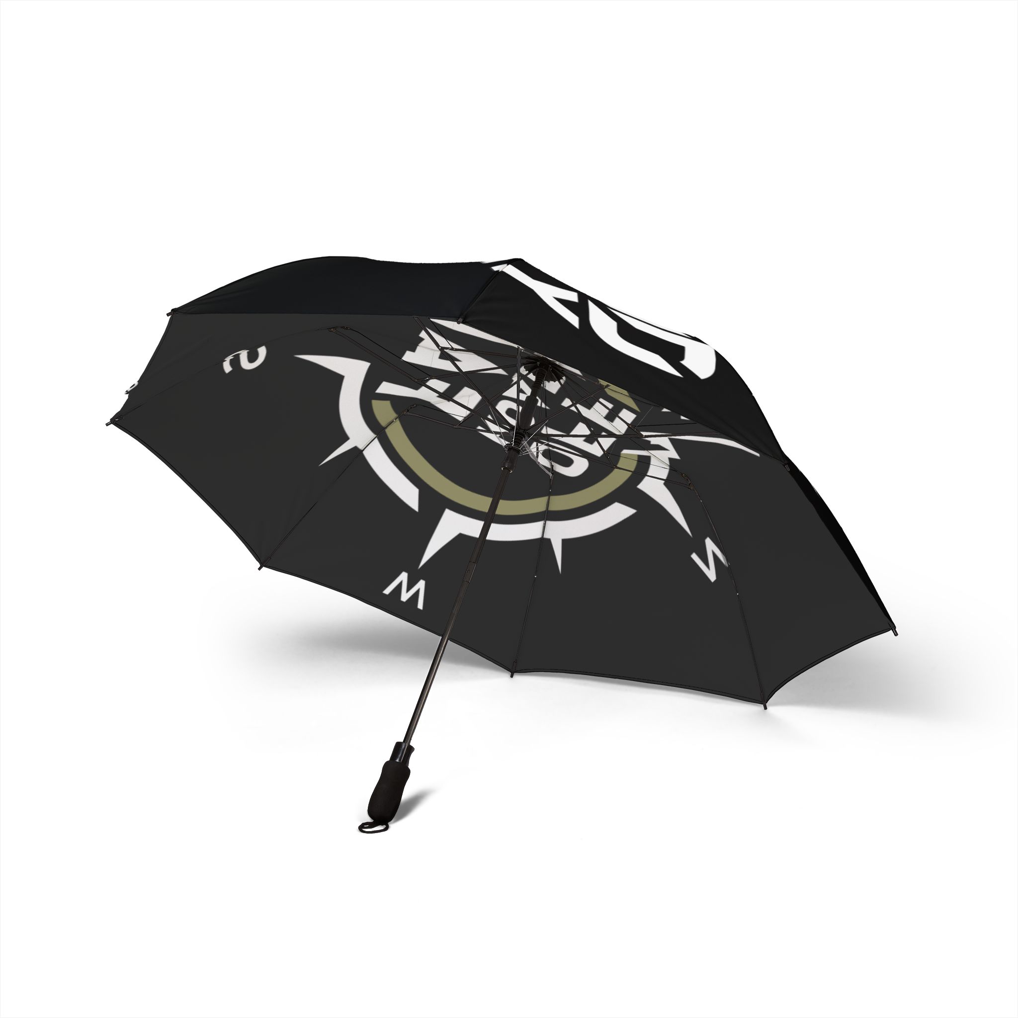 A compact, semi-automatic folding umbrella built for everyday adventures. The matte black canopy features a bold compass-and-mountain graphic in white and muted gold, giving it an outdoorsy, road-ready look that stands out in a crowd. Lightweight yet sturdy, the eight fiber ribs hold shape in gusts while the 100% polyester pongee fabric sheds water fast and resists fading thanks to heat sublimation printing. One-handed semi-automatic opening makes it quick to deploy when the sky turns, and the ergonomic rubber handle, wrist strap, and matching sleeve keep it comfortable to carry and easy to store. The sleeve mirrors the umbrella’s central design for a cohesive finish.